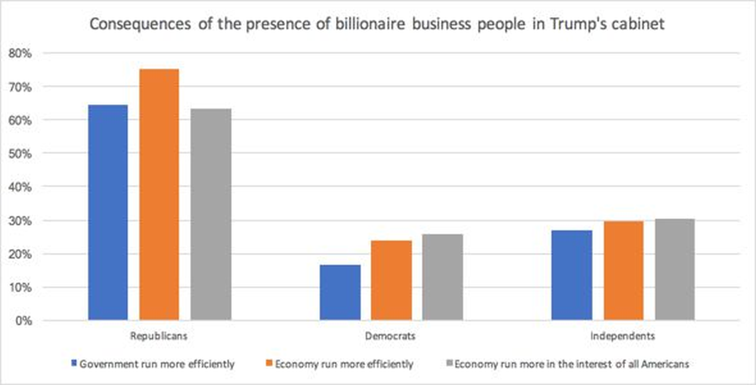 Un simile divario si riconferma sulla decisione di Trump di nominare diversi miliardari in posizioni chiave del suo governo. Queste nomine renderanno più efficace l’azione di governo per il 65 per cento dei repubblicani, cosa che pensano solo il 17 per cento dei democratici e il 27 per cento degli indipendenti. I repubblicani sono ancora più ottimisti circa il beneficio di queste nomine per l’economia ( 75 per cento, a fronte del 24 per cento dei democratici e del 30 per cento degli indipendenti). Persino tra i repubblicani l’entusiasmo svanisce un po’ alla domanda se queste nomine contribuiranno ad avere un’economia gestita “nell’interesse di tutti gli americani”. Solo il 63 per cento dei repubblicani lo crede, a fronte del 26 per cento dei democratici e del 30 per degli indipendenti.